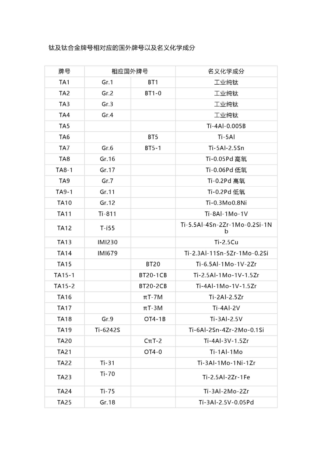 鈦及鈦合金牌號相對應的國外牌號以及名義化學成分